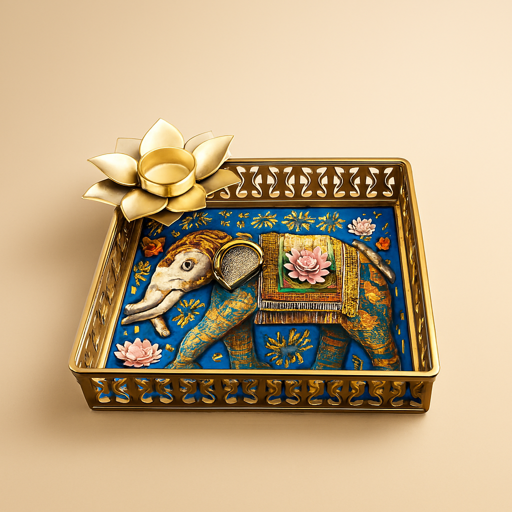 🎁 Elephant-Themed Decorative Pooja Tray with Lotus Candle Holder (Discount)