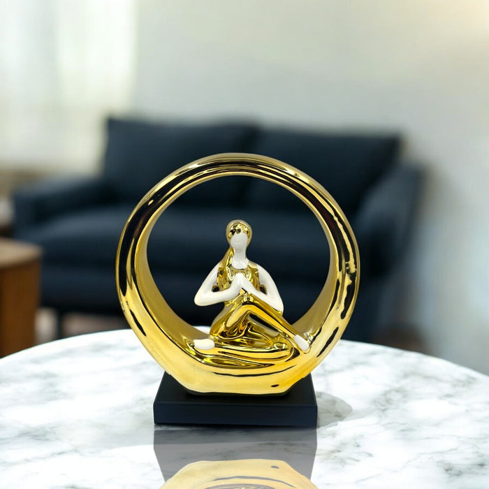 Elevate your home ambiance with the Golden Serenity Angel Meditation Figurine. Featuring an elegant angelic figure seated in a meditative pose, this masterpiece is framed by a graceful golden circular arch that symbolizes harmony and unity. The brilliant combination of polished golden and white finishes creates an aura of luxury and tranquility, making it an eye-catching centerpiece for any room.