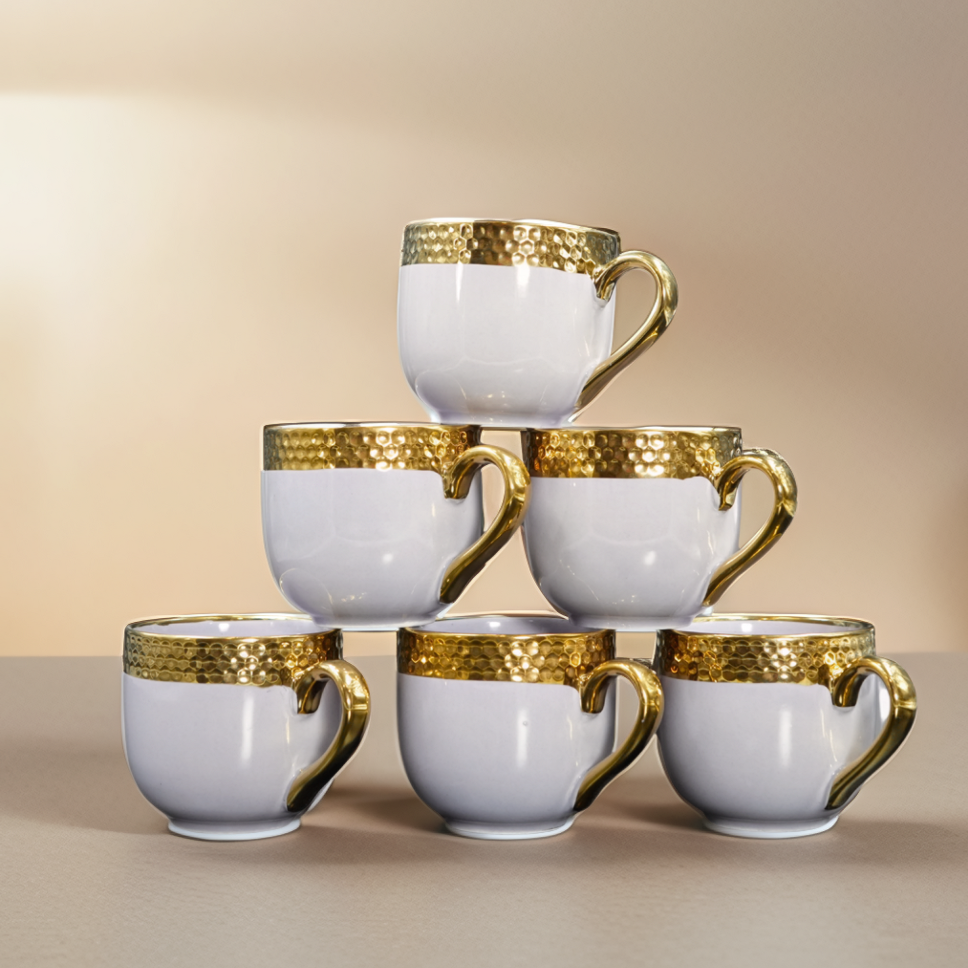 Elevate your tea and coffee experience with this elegant set of 6 premium ceramic mugs, beautifully designed with a glossy finish and a luxurious hammered golden rim. Available in multiple vibrant colors, these mugs bring sophistication and charm to every sip—perfect for daily use, gifting, or special occasions.