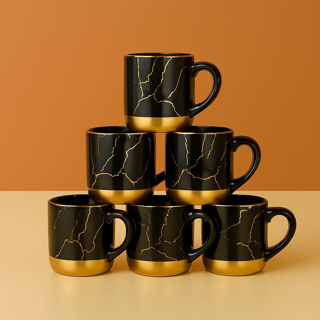 Luxury Grey & Gold Marble Ceramic Mug Set – 6 Pcs