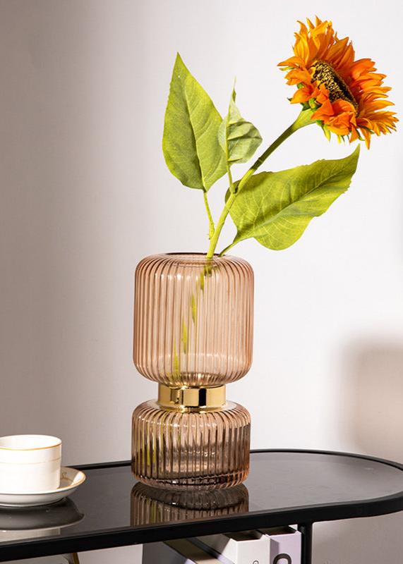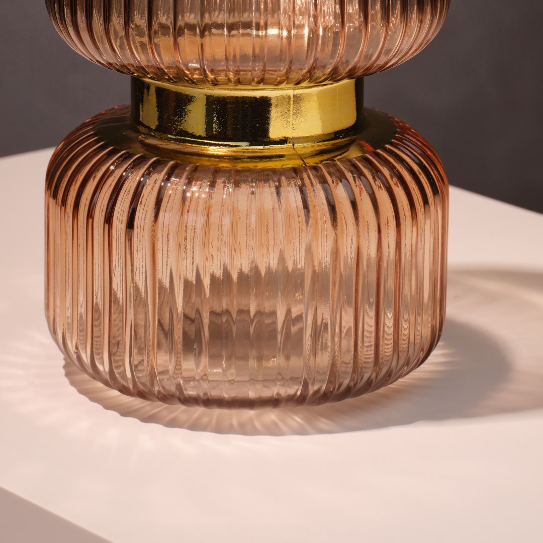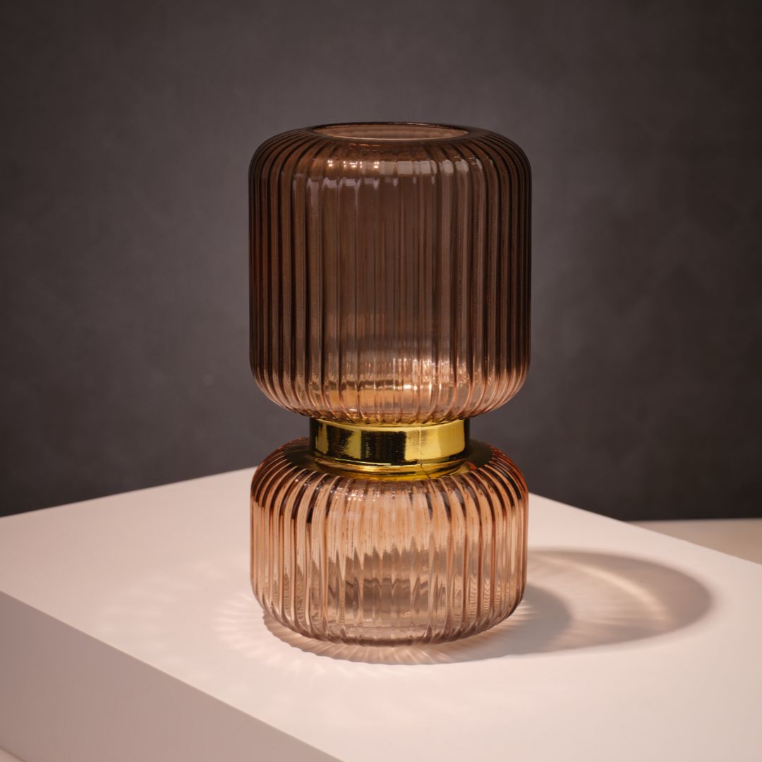 This sophisticated ribbed glass vase exudes elegance and modern style. With its cylindrical shape, warm amber hue, and refined gold accent at the center, this vase adds a touch of luxury to any space. The ribbed texture provides a distinct visual appeal, creating subtle reflections as light passes through. Ideal as a standalone statement piece or for displaying your favorite flowers, it fits perfectly in contemporary or classic interiors. Whether used in a living room, dining area, or office, this vase is designed to elevate your decor effortlessly.
