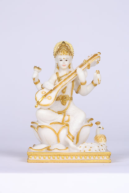 Invoke the blessings of knowledge, creativity, and purity with this serene idol of Goddess Saraswati. Crafted in a pristine white finish with elegant golden accents, the statue depicts the goddess gracefully playing the veena, seated on a lotus pedestal with her loyal peacock beside her. A perfect addition to your study, temple, or festive décor, inspiring intellect and spiritual growth.